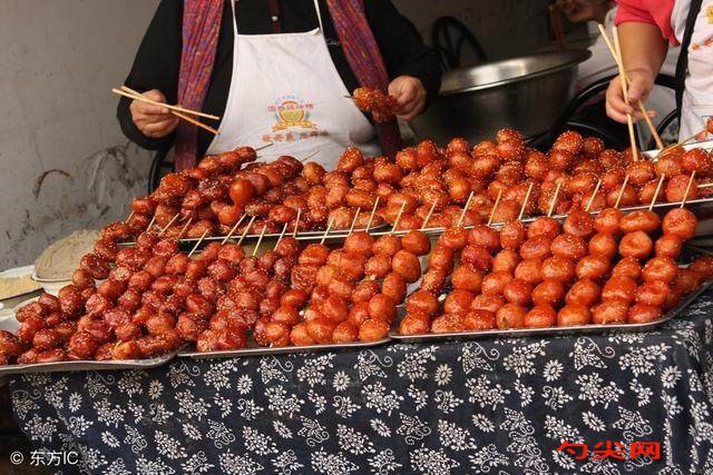 工艺:将糯米粉,籼米粉和泡多源K混合均匀后过筛,加入温水调制成软硬适中的粉团,并盖上湿毛巾饧制待用。取粉团再次搓揉光滑,切成重约25克的剂子30个,然后用拇指在剂子中心按个凹形,将剂子四周厚薄捏均匀后再收好口,使内部呈空心,即成生坯。锅置火上,注入菜籽油烧至110℃时转小火,加入切碎的红糖并用锅铲搅动,待糖与油全部溶化混合时,将生坯逐个从锅边滑入油锅中,用漏网勺和锅铲不断翻搅,待果子炸成亮闪闪的酱红色时,起锅沥油,撒裹上熟白芝麻,并将4~5颗果子用竹签穿成一串即成。首先,糯米粉和籼米粉应选用新鲜的粉料。因糯米粉黏性最大,籼米粉的胀性最大,二者以4∶1的比例混合,炸制时才容易空心,并保证外皮酥脆而内软糯,且久放不坍塌。其次,红糖是制作糖油果子的关键,应选用四川产的一级土方红糖为宜,加入量是油脂的25%~30%,在炸制过程中可使生坯易上色且不焦煳。第三,油脂选用菜籽油,炸制的糖油果子才能色泽光亮且香味浓郁;芝麻选用脱壳的白芝麻,用小火炒熟或烤箱烤熟。首先,调制米粉时水温以50℃为宜,便于米粉成团和生坯成形。因为米粉中的蛋白质不能形成面筋,起不到蛋白质的溶胀作用,因此提高水温,使淀粉糊化,产生黏性,把米粉颗粒紧紧地粘结在一起形成米粉团。其次,调制好的粉团要用湿毛巾盖上饧制,时间不少于2小时。其作用是使米粉团中未吸足水分的粉粒有充分吸收水分的时间;使米粉团松弛,防止生坯在炸制时爆裂。第三,生坯成形时采用“空心”包捏法,收口要紧,手心掀空搓光滑,便于生坯在炸制时保持空心。首先,锅中加入红糖时油温以110℃为宜,放入后调小火,并用锅铲不停铲搅,待红糖全部溶化且漂浮在油面后关火,避免糖液焦煳。其次,锅中油温至140℃且红糖沉入锅底时,加入生坯才易于生坯膨胀。第三,待生坯漂浮油面,开小火,用漏网勺和锅铲采用“推搅、翻搅、转搅”手法炸制,使其生坯受热和裹糖均匀,避免生坯爆裂。若在炸制过程中,生坯颜色不红亮,可适当加入一点切碎的红糖;炸制时生坯变成棕黄色时,可以将锅中的油适当舀出来一些,便于生坯快速上色;炸制时若生坯有粘连,可以用筷子轻轻将它们分拨开,并用锅铲在锅里翻搅,使其受热均匀。首先,白芝麻炒制或烤制时温度不宜过高,避免焦煳。其次,果坯在沥干油后,趁热采用“抖撒”手法,晃动大簸箕裹熟白芝麻,但不宜过多。第三,穿串时,最多5颗穿1串,穿其果坯的正中间。失败原因分析:籼米粉用量过多;粉团未搓揉光滑且饧制时间过短;生坯入油锅时,油温过高;未采用“推搅、翻搅、转搅”的炸制手法,生坯受热不均匀。空心度不够:粉团饧制时间过短;生坯包捏手法不正确,搓圆时手心未掀空;生坯炸制过程中油温过高;未采用“转搅”炸制手法。色泽暗红:红糖用量过多;炸制时间过长;起锅时油温过高。口感僵硬且焦煳:籼米粉用量过多;炸制时间过长;起锅时油温过高。出锅后坍塌:籼米粉用量过少;红糖用量过少;炸制时间过短。