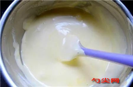 6、用手动打蛋器搅拌均匀,提起打蛋器时面糊可顺畅的留下,放置旁边备用。