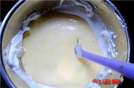 13、用橡皮刮刀翻拌或切拌的手法搅拌均匀,至看不到蛋白霜。
