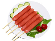 工艺:在进行绞肉操作前,先要检查金属筛板和刀刃是否吻合,金属筛板选用8mm,肉馅的温度冷却到零下3度,再分别对猪肉、肥膘进行绞制。将猪肉按比例添加精盐、硝酸钠、富磷联C,混合均匀,肉馅要压实,表面覆盖一层塑料薄膜,放低温库中存放12小时进行腌制,库温保持在0-4℃。在搅拌机里依次加入腌渍好的肉馅、水、分离蛋白和香辛料等,搅拌5分钟,最后加入淀粉和肥膘颗粒搅拌3分钟。采用天然肠衣或者蛋白肠衣,天然肠衣用猪肠衣,直径22-24mm,蛋白肠衣直径在22mm为好,可根据灌装肠衣的长度来控制肠体的重量,灌肠机采用真空灌肠机较好。这一步作为厂家根据自己的实际情况,可以不做成熟的,直接速冻包装;也可以加工成熟食,速冻包装。熟制的工艺可以按照下列进行。第一步:干燥30分钟,炉温60℃;第二步:蒸煮20分钟,炉温72℃;第三步:烘烤40分钟,炉温60℃。肠体摆放均匀,肠体之间不要挤压,挨着。