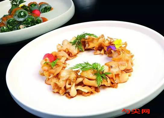 工艺:1、取活角螺肉500克摘去内脏、冲洗干净,片成2毫米厚的抹刀片。2、锅入清水烧开,离火下螺片焯10秒钟捞出,放冰水中过凉使口感爽脆,捞出吸干水分备用。3、芥末、味达蕾901#3克、陈醋、生抽各3克、美极鲜2克、白糖、蒜末少许调成料汁,与螺片充分拌匀,盛入盘中摆成花环状,点缀食用花草即可走菜。