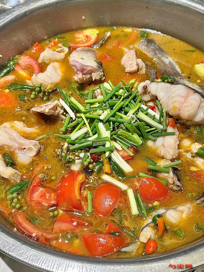 工艺:将鲍鱼去壳去内脏洗净,片成薄片放入碗中,加入盐1克、料酒5克、淀粉5克抓拌均匀腌制10分钟,泡发木耳撕成小朵,黄花菜切段,番茄去皮切丁备用,起锅烧水,加入料酒5克,将鲍鱼片焯水至变色后捞出沥干,起锅加入色拉油40克,放入姜末、蒜末、干辣椒段、花椒爆香,加入番茄丁翻炒出汁,加入野山椒继续翻炒,加入高汤大火煮开,转小火煮5分钟,加入木耳、黄花菜煮2分钟,加入盐3克、鸡精3克、白胡椒粉1克、白醋10克、味达蕾902号5克调味,将焯好的鲍鱼片放入酸汤中煮30秒入味,淀粉5克加少许水调成水淀粉,淋入锅中勾薄芡,撒上葱花。