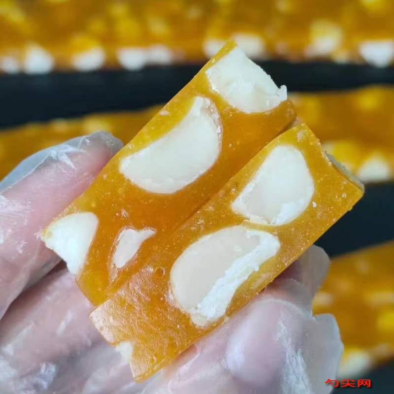 工艺:将洛神花洗净,加入适量清水煮沸,转小火煮约15分钟,捞出洛神花,保留洛神花汁,并过滤掉杂质,确保洛神花汁清澈。将麦芽糖浆、细砂糖、海藻糖和佳多美A04号混合均匀,加入洛神花汁中,用中火加热并不断搅拌,直至糖完全溶解且混合物变得粘稠。在加热过程中,可适量添加清水调节稠度,避免糖浆过于浓稠导致操作困难。当糖浆熬至约115°C(使用糖度计检测),加入食用香精,继续搅拌均匀。离火后,立即加入夏威夷果碎,快速拌匀,确保夏威夷果碎均匀分布在糖浆中。将糖浆倒入铺有油纸的模具中,用刮刀抹平表面,然后盖上另一张油纸,轻轻按压,排出气泡,使软糖更加平整。将模具放入冰箱冷藏室,冷藏约2-3小时,直至软糖完全凝固。取出模具,将软糖切成适当大小的小块,撒上少量糖粉防粘。将软糖块装入密封袋或包装盒中,即可销售或食用。