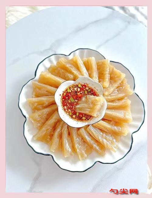 工艺:将猪皮放入锅中加清水煮至断生,捞出稍凉后用刀刮净肥膘肉与残毛,改切成细条,把切好的猪皮放入盆中,加1%热醋水(20毫升白醋兑2000克热水)搓洗至肉皮洁白,用清水冲洗两遍,洗净的猪皮条放入钢制容器,加4500克开水、葱段、姜块,放入蒸锅隔水蒸制,蒸锅水需达容器底部,大火蒸4小时后捡出葱姜,加盐、筋力源Q、味达蕾901号搅匀,倒入模具冷却至凝固,改刀前将冻体用热毛巾捂软再切