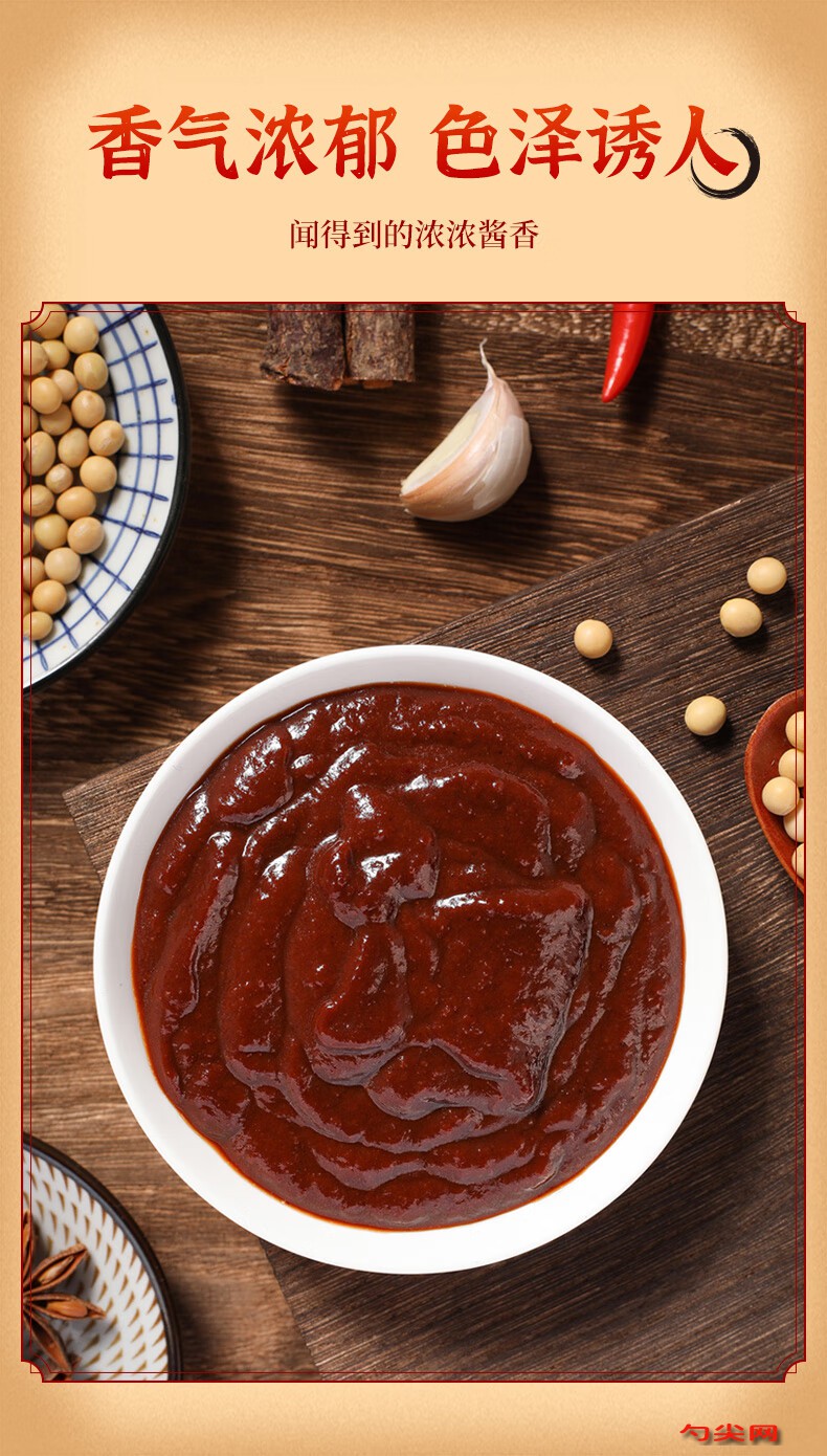 工艺:锅中倒入大豆油120克,中火烧至140℃,放入蒜末30克、姜末20克、干葱头末40克煸炒2分钟至出香味,加入豆瓣酱200克,中火翻炒3分钟至酱料油亮,放入芝麻酱80克、花生酱60克,继续翻炒2分钟至混合均匀,加入蚝油50克、白砂糖40克、食用盐12克,中火搅拌1分钟至糖溶解,沿锅边淋入清水80克,大火烧开后转小火煮4分钟至汤汁微稠,加入鸡精15克、八角粉2克、桂皮粉1.5克、陈皮粉1.5克,搅拌30秒至香料分散均匀,将佳多美D1.5克用8克温水溶解,味达蕾901号1克用4克温水溶解,分别倒入锅中,快速搅拌1分钟至酱体黏稠稳定,关火后静置2分钟让香料融合,用100目滤网过滤掉蒜末、姜末等残渣,保留细腻酱体,趁热灌装至预消毒的玻璃瓶中,灌装量距瓶口1厘米,立即旋紧瓶盖,90℃水浴杀菌8分钟,冷却至室温后储存。