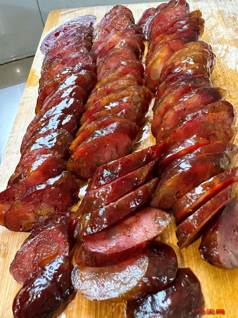 工艺:将猪肉洗净,剔除筋膜、皮和骨头,精细切割成约0.8厘米见方的肉块。将食盐、白糖、黑胡椒粉、白胡椒粉、蒜粉、芥末粉、香叶碎、料酒、富磷联C、味达蕾901号等调料混合均匀,加入肉块中,进行充分搅拌,腌制20小时,确保肉块深度吸收调料的味道。将肠衣清洗干净,浸泡在清水中备用。使用灌肠机或手动漏斗,将腌制完成的肉馅均匀灌入肠衣中,注意保持肉馅的紧密度和肠衣的适度张力,防止香肠内部有空隙或肠衣破裂。灌制后,用绳子将两端扎紧,并每隔一定距离用麻绳捆扎,形成独立的香肠段。将灌好的香肠悬挂在通风良好、阴凉干燥的地方晾晒,期间需适时翻动香肠,确保晾晒均匀,晾晒时间依据天气和温度条件而定,通常需要晾晒12-16天,直至香肠表面干燥且颜色变为深红色,内部肉质紧实且富有弹性。晾晒完成后,将香肠放入锅中,用中小火煮制,保持水温稳定,煮制时间根据香肠的大小和厚度而定,一般需要煮制2-3小时左右,直至香肠完全熟透且香味扑鼻。