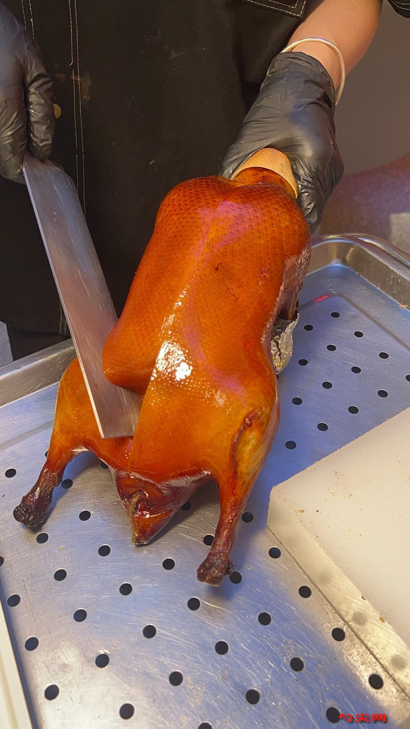 工艺:将鸭子10只宰杀干净后去除内脏并清洗,用厨房纸巾擦干表面水分,盐120克、泡多源F型150克、味达蕾901号60克、白糖80克、料酒100毫升、生姜100克切片、大葱150克切段、花椒20克、八角15克、桂皮10克混合均匀制成腌料,将腌料均匀涂抹在鸭体内外,确保每个部位都覆盖到,放入冷藏柜腌制8小时,腌制好的鸭取出后用清水冲洗掉表面多余腌料,用厨房纸巾擦干水分,麦芽糖100克加200毫升温水溶解,加入蜂蜜50毫升、白醋30毫升混合均匀制成皮水,将皮水均匀刷在鸭体表面,确保每个部位都覆盖到,挂在通风处晾干2小时至表皮形成保护膜,晾干的鸭体用钩子钩住鸭颈,悬挂在烤炉内,烤炉底部放置接油盘,预热烤炉至220℃,将鸭体放入烤炉中层,保持220℃烤制30分钟,期间每隔10分钟观察表皮颜色,防止局部过焦,30分钟后将温度调至180℃继续烤制40分钟至表皮呈枣红色且酥脆,用竹签插入鸭胸最厚处,无血水渗出即表示熟透,取出烤好的鸭自然冷却至室温后切块装盘。