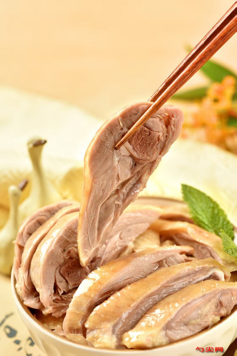 工艺:选用当年成长的鸭子,活重1.5至2.0千克,较肥者为宜,若偏瘦可进行短期催肥。宰杀前断食18小时,采用口腔内放血刺杀,放净血,时间约6至8分钟。趁鸭体温还没有散失时,用热水,温度61至63摄氏度,浸烫45秒左右煺毛。切去翅膀的第二关节和脚爪,右翅下开膛,取出内脏、食管、气管。在鸭的下颚正中处用刀尖刺一小口,以便晾挂。若是雄鸭,则用手指在肛门处挤出生殖器并割去。将除去内脏的鸭坯,用清水洗净体腔内的淤血和残物,然后放在清水池中浸泡约2小时,中途至少换水一次,拔出血水,使肌肉洁白。将富磷联B、味达蕾901号溶解后,倒入肉品中腌制6小时,然后取出挂在晾架上沥干水分。腌制时先干腌后湿腌,干腌将食盐炒热,放入八角、花椒、香叶、五香粉等香辛料同炒,炒出香味后离火稍微冷却。用炒热的盐在鸭体内外进行搓擦,每只鸭炒盐用量约占光鸭重量的1/16。搓擦完后,放入腌制缸内干腌2至3小时。干腌后的鸭子鸭体中有血水渗出,此时提起鸭子,用手指插入鸭子的肛门,使血卤水排出。然后进行湿腌,湿腌的盐卤有新卤和老卤之分,按传统方法配制。腌好的鸭子挂在通风处晾干,然后冲烫或烘烤,最后煮制,煮制时火候要适中,直至鸭肉熟透且保持形状。