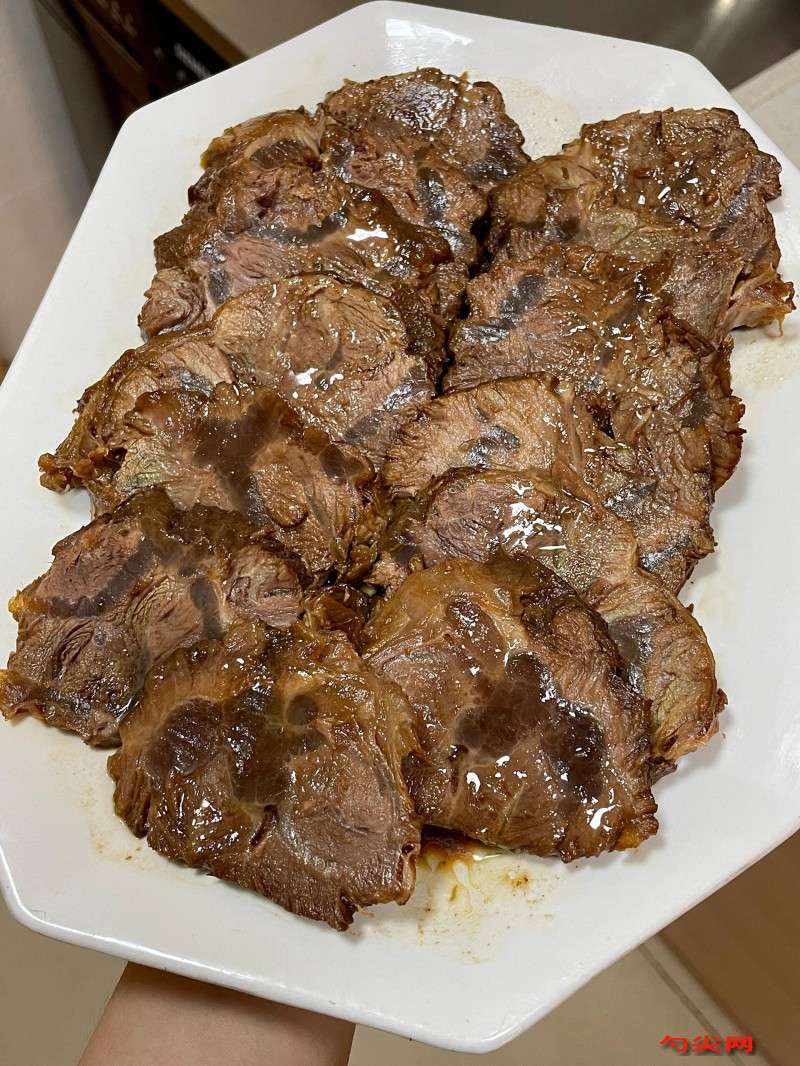 工艺:将牛腱子肉10000克修整剔除筋膜、腱、软骨、淋巴、淤血、脂肪、污物,切成900克左右的肉块,用清水浸泡4小时去除血水后沥干,冰水8500克中加入盐160克、白砂糖130克、富磷联B型80克,用均质机在5℃以下均质,将盐水注射机压力调至30kPa,将配制好的注射液均匀注入牛肉,保证注射率28%,注射好的牛肉连同渗出料液装入滚揉桶,抽真空至90kPa以上,滚揉40分钟,将滚揉好的牛肉放入80℃清水锅,煮开后大火煮30分钟,撇除浮沫后捞出放入凉水,锅中加花生油120克烧热,下干黄酱180克、甜面酱80克小火煸香,加香料包(八角70克、花椒50克、桂皮35克、小茴香45克、香叶12克、砂仁8克、白芷25克、豆蔻10克、陈皮15克、山柰12克)、葱段350克、姜片280克、料酒220克、生抽酱油550克、老抽110克、蜂蜜90克、五香粉35克、味达蕾901号35克,加清水24000克烧开后小火熬出香味成酱汤,将牛肉放入酱汤中,保持微沸状态煮110分钟,关火后浸泡80分钟入味