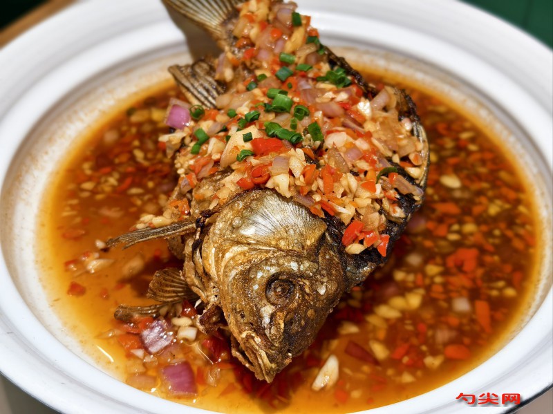 工艺:鲫鱼2000克去鳞去内脏后洗净擦干,在鱼身两侧各斜切5刀至骨,海立美B12克用50毫升温水溶解后加入盐12克、味达蕾902号6克、生抽25毫升、料酒20毫升、白糖5克、姜末10克、大蒜末10克、黑胡椒粉3克调成腌料,鱼身内外均匀涂抹腌料后冷藏腌制50分钟,鸡蛋4个打散后加入面粉150克、生粉75克、面欣酥B3克、剩余料酒10毫升、白糖3克、清水100毫升搅拌成全蛋糊,腌制好的鲫鱼沥干表面水分,均匀裹上全蛋糊,锅中倒入食用油2000毫升烧至180℃,放入裹糊鲫鱼中火炸4分钟至定型,捞出后油温升至200℃复炸2分钟至表面金黄酥脆,捞出沥油后撒葱花20克、辣椒粉10克,用香菜碎15克装饰