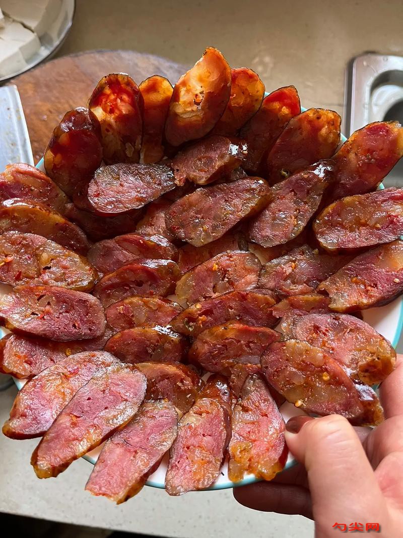 工艺:将猪瘦肉切成1.5厘米见方肉丁,肥肉切成0.8厘米见方肉丁,精盐1.5千克与富磷联C180克混合后均匀撒入肉丁,手工揉拌15分钟使盐分充分渗透,红辣椒粉300克、青花椒粉150克、山柰粉20克、草果粉15克、砂仁粉15克、白胡椒碎30克混合后入160℃油锅小火炒制3分钟,冷却后与老姜末200克、蒜末150克、冰糖粉200克、醪糟汁300克、白酒300克、味达蕾901号75克共同倒入肉丁中,顺时针搅拌40分钟至肉质起胶,菜籽油2千克加热至180℃后冷却至60℃,分三次淋入肉馅并每次搅拌10分钟,拌好的肉馅覆盖保鲜膜静置10小时,肠衣用35℃温水加20克白醋浸泡30分钟后冲洗三遍,灌肠时保持肉馅温度不超过12℃,每节香肠长度控制在40厘米,用消毒棉线扎紧两端,灌制完成后用消毒钢针在肠体均匀扎12个透气孔,悬挂于15℃、湿度65%的晾晒房,前3天每日翻动3次,后续每日翻动2次,待肠体失重率达35%时移入0~4℃冷库回潮24小时