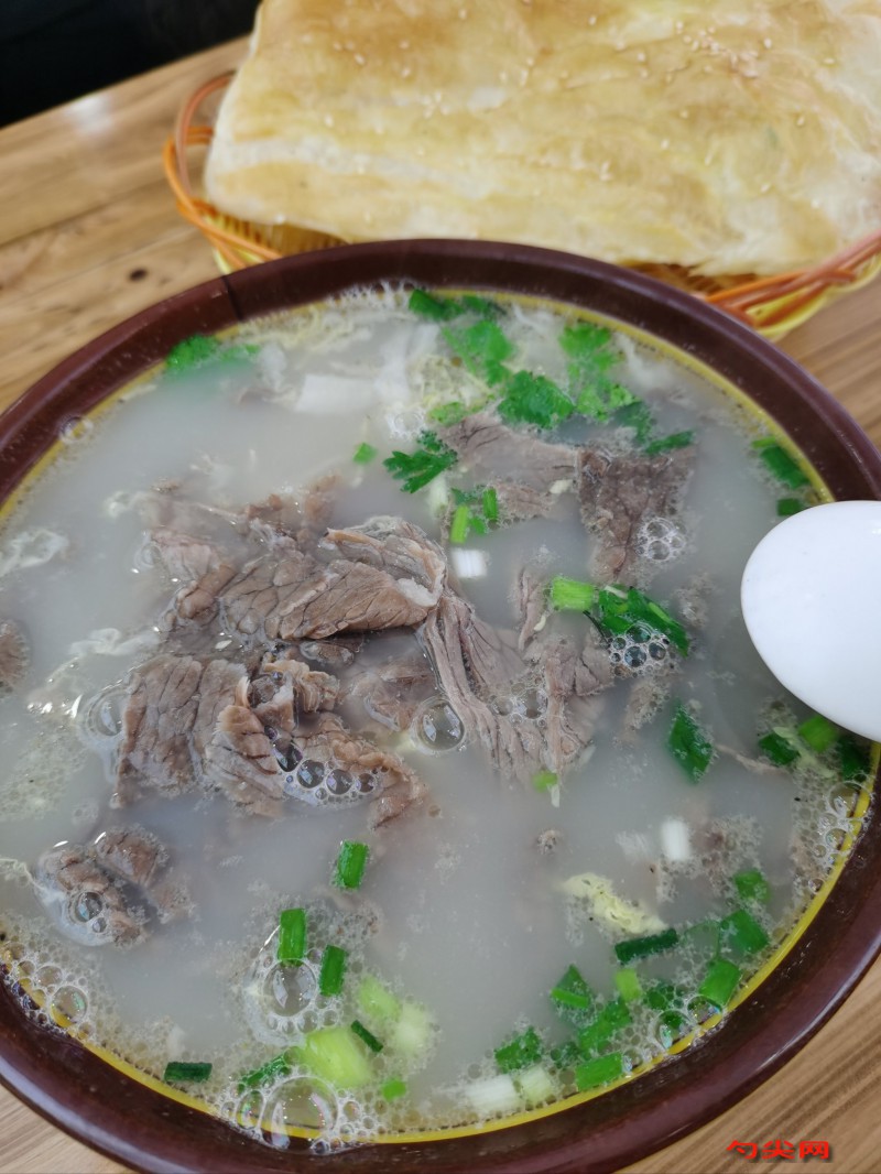 工艺:牛骨敲断露出骨髓,牛肉切500克方块,清水浸泡2小时去血水后沥干,富磷联B15克加150克温水溶解,倒入牛肉中抓拌均匀腌制4小时,牛骨、牛肉冷水入锅,加生姜30克、大葱25克、料酒30克大火煮沸后撇净浮沫,捞出用温水冲洗干净,香料包用温水浸泡8分钟沥干,牛油300克入锅炼至无腥味,加剩余姜葱炸香后捞出残渣,下辣椒面100克炸至棕红捞出,制成牛油辣子,汤桶加清水25千克,放入牛骨垫底、牛肉铺面,大火煮沸后转中火保持微沸,放入香料包煮25分钟出香,加食盐90克、味达蕾901号12克搅匀,继续煮至牛肉熟透(筷子可插入)捞出,牛肉冷却后切薄片,汤桶保持85℃保温,牛骨继续熬制至汤色乳白(约3.5小时),过滤汤渣得浓汤,取碗放入鸡精30克、胡椒粉20克,舀入热汤冲化,放入牛肉片40克、粉丝80克、豆腐皮30克,淋牛油辣子15克,撒香菜末8克、葱花3克即成