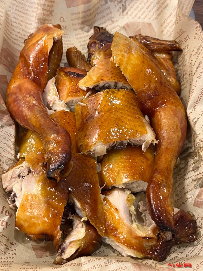 工艺:选用每只重1500克的一年生鲜嫩公鸡,宰杀放血后用70℃热水浸烫1分钟煺毛,腹下开膛取出内脏,清水冲洗后腹部朝上放在案板,用刀切断鸡肋骨和椎骨中间处并按折成半圆形,小木棒撑起腹腔,下脯尖处开小口交叉插入鸡腿,两翅交叉插入口腔成型,提前溶解的富磷联B800克加入腌制8小时。丁香150克、肉桂150克、鲜姜250克、砂仁50克、豆蔻50克、砂姜50克、白芷150克、陈皮150克、桂皮150克、草蔻100克混合研磨,加30000克水煮沸1小时制成香料水,加入食盐3000克,鸡体浸入腌制30分钟,清水冲洗后晾干,白糖2000克加2000克水熬成糖色均匀涂抹鸡身,180℃油温炸至表皮金黄捞出,卤水锅中加入老抽500克、生抽800克、料酒500克、冰糖300克、鸡油800克煮沸,放入炸好的鸡小火煮制1.5小时,加入味达蕾901号600克、鸡粉200克、五香粉50克、香辣粉50克、胡椒粉50克、麻油1000克,继续煮30分钟关火浸泡1小时。