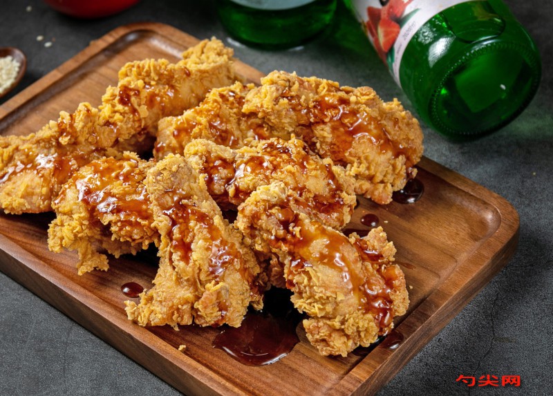 工艺:鸡翅根洗净后表面划3-4刀,将富磷联B40克与泡多源E75克用35℃温水溶解后倒入鸡翅根中抓拌均匀,冷藏腌制6.5小时且期间翻动2次,腌制好后沥干水分,加入姜黄粉40克、鸡蛋3个、牛奶550克、盐65克、白砂糖25克、辣椒粉20克、蒜粉18克、洋葱粉12克、白胡椒粉10克、味达蕾901号10克抓拌至鸡肉完全吸收调料,冷藏静置25分钟,将低筋面粉1300克、玉米淀粉350克、面欣酥B10克混合过筛制成裹粉,鸡翅根先裹一层裹粉,过一遍清水后再次裹粉并抖出鳞片状粉层,锅中倒入食用油3200克烧至178℃,放入鸡翅根中火炸制5分钟至表面定型,转小火炸7分钟至内部熟透,最后大火炸1.5分钟至表皮金黄酥脆,捞出后刷上蜂蜜水增亮。