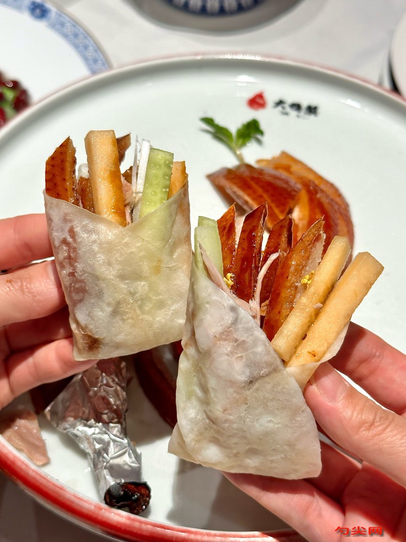 工艺:将泡多源F130克与味达蕾901号45克用45℃温水溶解后倒入腌制桶,加入盐190克、白砂糖110克、姜片250克、葱段250克、八角18克、桂皮12克、香叶6克、花椒12克混合均匀制成腌料,鸭子宰杀后冲净血水,将腌料与11千克清水搅拌溶解,鸭子浸入腌汁中4℃环境下腌制10小时且每2.5小时翻动一次,腌制后取出鸭子,在右翅下开4.5cm月牙口,取出内脏并冲洗内腔,用8cm秸秆插入腹腔支撑胸骨,将鸭子挂在通风处用风扇吹10小时至表皮干燥,麦芽糖160克、白醋130克、大红浙醋90克、米酒110克混合加热至45℃制成皮水,用刷子均匀涂抹鸭身3次,每次间隔12分钟,将鸭子挂在钩上,先用105℃沸水烫皮12秒,立即过冷水收紧表皮,挂入预热至260℃的果木烤炉,鸭胸朝火烤22分钟,转鸭背朝火烤18分钟,最后鸭胸朝火烤12分钟至表皮枣红色且酥脆。