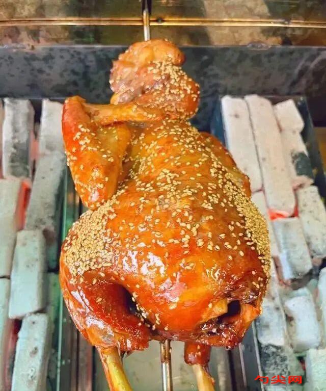 工艺流程:调制腌料:将所有调料与龙井茶水混合,搅拌均匀备用。用注射器吸满腌料,分别向鸡肉的胸部、背部、腿部每个部分均匀注射,每部分约100毫升。用钢叉穿入鸡肉,取锡纸将鸡表面涂抹豆油后用锡纸包裹,腌制8小时以上。炭烤阶段将腌制好的鸡肉带着锡纸在炭火上烤制70分钟,过程中需不断换面烤制。70分钟后取出鸡肉,剥掉锡纸,继续放到炭火上烤制10分钟,将鸡肉表皮烤制金黄。在鸡肉表面涂抹一层黄豆油,方便沾上调料。在鸡的表面洒满熟芝麻、烧烤调味料、孜然粉、辣椒粉。
