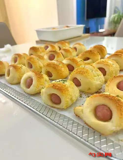 注意事项:现配现用效果最佳,溶解水温不得超过25℃,面团揉至扩展阶段即可,过度揉面会导致断筋,发酵环境湿度需控制在75%左右,湿度过低表皮易干裂,香肠需选用直径2.5厘米的爆汁肠,过细会导致包裹不严,烘烤温度需根据烤箱实际调整,上色过快可加盖锡纸,冷却后需密封保存,暴露空气超过4小时会变硬,复热时表面喷少量水,150℃烘烤3分钟恢复口感,储存未烤制的面团需冷藏,超过12小时会影响膨松度。