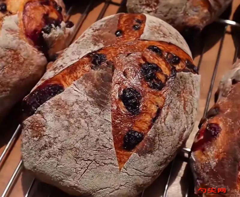 工艺流程:1、高筋面粉、t65、佳多美Q,倍田4号和芭乐汁搅拌均匀水解30分钟,加入鲁邦种、酵母搅匀,加入盐,打到表面光滑加入后加水,加完搅匀打到9成筋。2、加入蓝莓、巧克力豆慢速拌匀即可,出缸放入发酵盒醒发40分钟,翻面一次送入3度冰箱冷藏一夜,第二天拿出来回温到12度以上,分割220g/个。3、轻排气预整形松弛20分钟,轻拍三折卷起整形室温醒发60分钟,醒发完成放到高温布上面,化刀口化一个X出来,4、烤炉提前预热,入炉烘烤上火270度/下火210度,打5秒蒸汽烘烤时间13分钟左右即可。