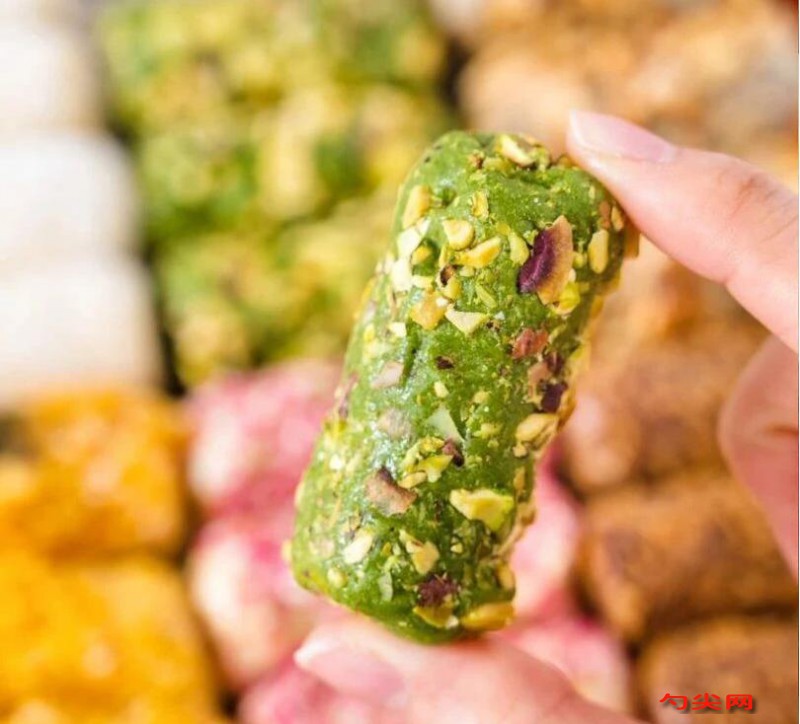 工艺:(1)黄油加入奶锅开小火煮融化后煮至焦褐色。(注意不能煮得太过,太过会糊)(2)白巧克力加入煮好的榛子黄油融化巧克力。(如果煮好的榛子黄油没有温度需要将白巧克力另外隔水融化至液体加入搅拌均匀)(3)奶粉,开心果酱加入拌均匀后装裱花袋放凉备用。奶酥卷糊:(1)黄油,海盐,水饴融化液体状态(需要用到不粘锅)把黄油放入不粘锅中,开小火融化材料。(2)棉花糖加入炒软化(全程小火(3)加入奶粉,泡多源G,抹茶粉快速翻拌均匀,将粉类完全吸收后关火放凉至不烫手,温度大约在40-50度左右3、组装搭配:(1)准备一个5cm*2cm蛋卷,(2)挤入开心果夹心馅料(2.5g-3g)一个,挤好后放常温至凝固大约30分钟。(3)取出10g-12g奶酥糊,包裹住5cm*2cm蛋卷,搓均(4)最后均匀裹上开心果碎或者抹茶粉,可以轻轻按压,帮助粘合。(5)装入5cm*11cm的机封袋,用封口机封口即可。