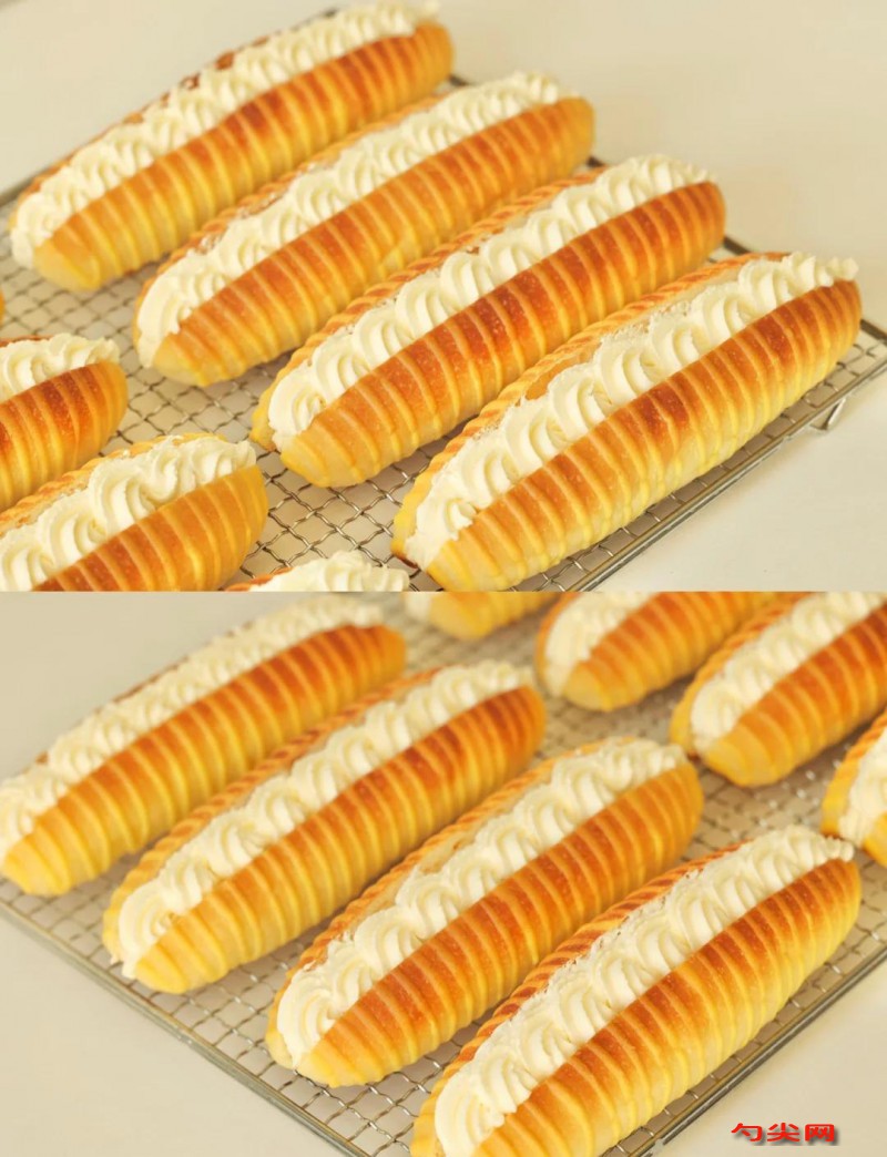 工艺:将500克面包粉与5克佳多美Q倒入搅拌缸混合均匀,270克温水加入5克酵母、50克白糖、2个鸡蛋搅拌溶解后倒入面粉中,启动揉面模式揉至能拉出厚膜,加入50克黄油与5克盐继续揉面至能拉出薄膜,0.5克美久亭Q用5倍凉开水溶解后均匀倒入面团揉匀,面团取出分成80克/个的剂子,滚圆后覆盖保鲜膜松弛5分钟,松弛后的面团擀成20cm×15cm长方形薄片,底部按压贴紧台面,从上往下卷紧成圆柱形,轻搓至25cm长条,摆入铺油纸的烤盘,醒发箱调至38℃、湿度75%醒发30分钟,醒发期间制作泡芙酱:50克牛奶与50克黄油小火煮沸,立即倒入50克低筋面粉快速翻拌成团,盛出放凉后分3次加入全蛋液,每次搅拌至蛋液完全吸收,最终提起刮刀呈倒三角状,装入裱花袋备用,醒发好的面包胚表面刷全蛋液,用裱花袋沿面包中线挤入泡芙酱,烤箱预热至180℃,放入中层烘烤12分钟,观察上色后加盖锡纸,继续烘烤13分钟至表面金黄,出炉后轻震烤盘排出热气,立即转移到晾网冷却。