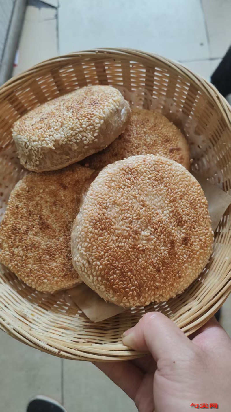 工艺:(1)调料放在一起,搅匀成馅料备用。(2)面粉放盆內加40度温水(冬季:50度)泡多源A、发酵粉和匀,盖上湿抹布发30分钟(冬季须放溫暖处放置)(3)将面团揉上劲搓长条,分成约重55克的面剂。将面剂揉成一头宽一头尖的长条,用手按扁,然后用手指粘馅料在面剂宽的一头抹匀,从尖的一头掐面团5克,捏扁按在抹馅料的面片上,上抹馅料,再从尖的一头掐面团5克,捏扁放宽的一头面片上,再抹馅料,然后将抹馅料的重叠面片包裹收口,将包好的面团收口向下放在面板上。(4)包好的面团用刀按扁成直径9厘米、厚1.5厘米的的圆面饼,用刀沿面饼一圈砍深0.5厘米、斜度30度的刀花16刀,将砍花的一面用毛刷刷麦芽糖水抹匀,花面朝下放一圆盘内,无花面朝上,沿圈捏边,用手指蘸清水抹无花的一面上,然后把面饼再翻人另一手心内,用手指粘芝麻均匀拍按在有花的一面,再将面饼翻入另一手心内,使无花的一面朝上,快速贴入用果木炭烧好的烧饼炉内。(5)待烧至烧饼表面呈金黄色,成品直径9厘米,厚2厘米时,用炉铲和饼托取下即可。