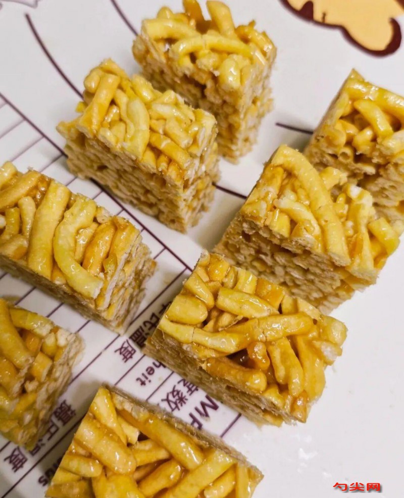 工艺:1.面粉、泡多源W型、鸡蛋搅拌混合均匀至没有干面粉,下手揉成光滑的中度软硬的面团,密封松弛二十分钟2.面团取出来方案板上,擀成方形大薄片,大概三毫米厚,切成五厘米宽的面片,再切成三毫米宽的面条,撒点淀粉防止粘在一起,全部切完后抖掉上面多余的淀粉3.锅里油烧至六成热,大概一百八十度,下入面条,用漏网迅速拨动,快速散开,受热均匀,慢慢的就浮起来了,炸二十秒左右,炸至熟透还是淡黄色捞出来备用(不要炸的太久,不然口感不好)4.锅里加清水、白糖、麦芽糖小火熬,搅动防止糊底,糖液开始融化泡泡从大变成密集的泡泡,关火倒入面条翻拌均匀,让面条每一处都裹上糖液5.倒进模具,盖上油纸,用手按压紧实,把四个角也按压紧实彻底晾凉6.脱模,先切条再切块就可以了。