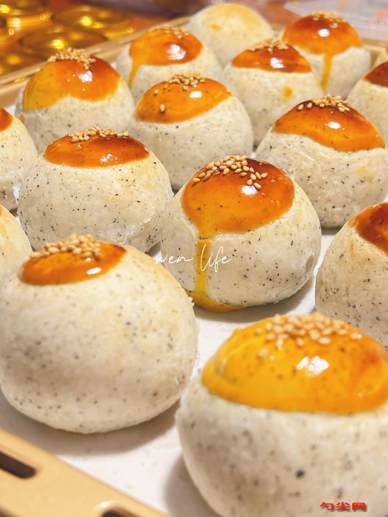工艺:美久亭Q型用数倍凉开水溶解备用,制作水油皮,将中筋面粉、面欣酥E型干拌均匀,加入白糖、清水搅拌至无干面粉,加食用油多揉一会儿成团,倒入溶解后的美久亭Q型水溶液再揉光滑,盖上保鲜膜松弛30分钟。制作油酥面,取低筋面粉加食用油搅拌均匀成湿软不成型的面团。准备馅料,豆沙馅搓成长条,分成30克左右小剂子搓圆按扁,包入一个咸蛋黄,用虎口收拢整理严实搓圆。把松弛好的水油皮擀成圆饼放上油酥面包起来收口捏紧,轻轻擀开擀薄擀宽,从一端卷紧密,分成30克左右剂子,在剂子中间按坑,两端折进来按扁擀成圆片,放上蛋黄馅用虎口慢慢收拢,收口捏紧整理圆润。放烤盘上,表面刷蛋黄液撒黑芝麻,烤箱180度烤30分钟烤至金黄熟透即可。