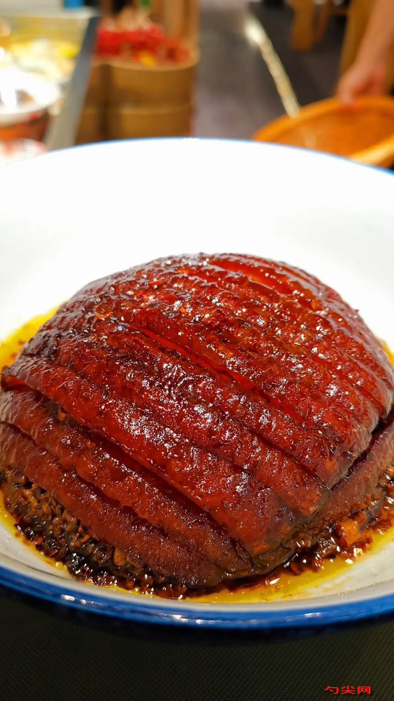 工艺:选用经卫生检验合格的带皮去骨猪肋条肉为原料修净残毛淤血碎骨等然后切成10cm宽的方块肉,将修整好的猪肋条肉加入富磷联B型腌制6小时,然后放入锅内煮制上下翻动数次煮沸20~30min后捞出,取出预煮的熟肉用细尖竹签均匀地戳皮但不要戳烂皮,在皮面上涂擦少许食盐和稀糖(1份麦芽糖3份食醋配成)放入油温维持在100~120℃的油锅中炸制30~40min当皮炸起小泡时把油温提高至180~220℃再炸2~3min直到皮面起许多大泡并呈金黄色时捞出,为防皮炸焦油锅底放一层铁网锅内油不需过多因主要炸皮面否则因油炸时间长影响成品率,将油炸后的大肉块切成1cm厚的肉片与食盐600g,白糖1kg,白酒1.5kg,酱油2.5kg,鸡粉300g,味达蕾901号200g,美久亭A型50g,八角粉100g,花椒粉100g,南乳1.5kg,水4kg拌匀然后把肉片整齐地排在碗内皮朝下放在锅内蒸1.5~2h上桌时把肉扣到盘子里即为成品.