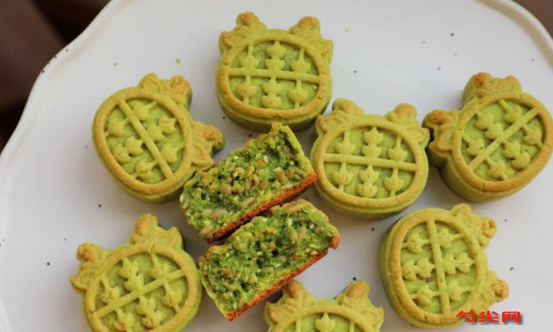 工艺流程:饼皮:玉米油、细砂糖、糖浆、全蛋液混合搅拌至乳化(无油星),加入开心果酱拌匀。粉类(高筋面粉+低筋面粉+佳多美Q型+美久亭Q型)提前混合过筛,加入液体中翻拌成团,调整至耳垂般柔软度,盖保鲜膜冷藏松弛2小时。所有馅料材料混合揉搓成团,分割为30g/个,搓圆备用。饼皮分割为20g/个,压扁后包入馅料,收口捏紧,用模具压出花纹。烤箱预热至180°C,上下火中层烤15分钟,表面微黄即可。