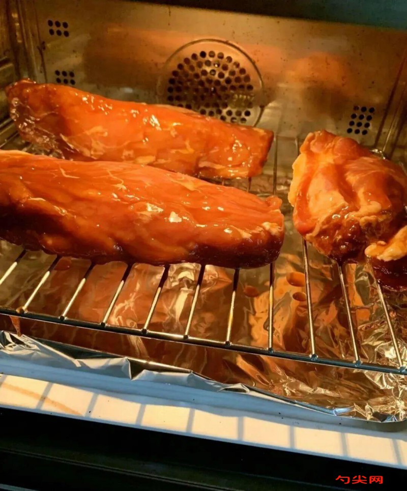 工艺:腌渍时间与操作肉条扎孔(用牙签或叉子均匀扎孔),浸入腌料后密封,4℃冷藏24小时(每延长1小时嫩度提升3%)。腌料需完全覆盖肉条,中途可翻面一次确保入味均匀。烤制三重功底中温定型:烤箱预热160℃,肉条平铺于铺油纸的烤盘,烤20分钟→蛋白质凝固锁汁,形成柔韧肉芯。高温淬釉:转220℃烤8分钟→麦芽糖焦化结硬壳,焦糖香爆发。蜜浴重生:出炉后速刷蜂蜜水(蜂蜜:水=1:1),利用余温使脆壳龟裂如琥珀纹。明炉炭火秘技(传统派)前期用荔枝木烟熏10分钟赋予果香,后期撤火留炭,辐射热逼出脂肪,达成“肥肉透明如琉璃”的境界。电烤箱替代方案预热200℃,肉条放中层烤20分钟,取出刷腌料+蜂蜜水,翻面再烤15分钟。最后5分钟调至220℃让表面微焦,取出静置10分钟刷酱(酱料可用腌料+蜂蜜水混合)。斜刀断纤:45°角下刀切断肌束,减轻咀嚼阻力。