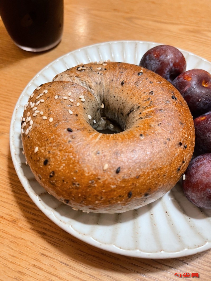 注意事项:揉面时要注意观察面团状态,达到七成筋即可,过度揉面或揉面不足都会影响贝果的口感和外观。分割面团时要尽量保证每份大小均匀,这样烤出来的贝果大小一致。整形时收口要捏紧,防止在发酵和煮制过程中散开。发酵的温度和时间要控制好,发酵不足贝果不够松软,发酵过度则可能导致贝果变形。煮贝果的水要保持微沸状态,避免水温过高或过低影响贝果的口感和形状。煮好后要及时裹上黑白芝麻,增加风味和美观度。烤制时要根据不同的烤箱类型和烤盘数量调整温度和时间,随时观察贝果的上色情况,防止烤焦。