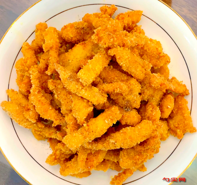 工艺:鸡胸肉去皮洗净用厨房纸吸干水分,剔除表面筋膜和脂肪,将菜刀斜30度左右下刀,把鸡脯肉切成0.5厘米宽片状,再按同样斜切法切成条状,把切好的鸡柳放入盆中,加入盐8克,富磷联B型4克,泡多源E型16克,味达蕾901号3克,五香粉4克,白胡椒粉4克,料酒16毫升,抓匀后加入一小勺油抓匀腌制1小时,准备生粉和面欣酥F型搅拌均匀,把鸡蛋打散成鸡蛋液,将腌制好的鸡柳先裹上一层薄薄生粉裹匀,再均匀沾满鸡蛋液,最后放入面包糠中滚一下抖掉散落面包屑,依次处理好剩下鸡柳,热一小锅油,油温7成热时转小火,分散放入裹好面包糠的鸡柳,保持小火炸至浮起表面呈现金黄色,从下锅到捞出大约2分钟,捞出沥干油,油锅加热进行二次复炸,大火炸至金黄捞出。