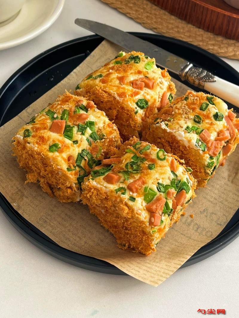 工艺:将5个鸡蛋蛋清和蛋黄分离,蛋清放入无油无水的打蛋盆中,蛋黄放入另一个碗中,在蛋黄碗中加入10克细砂糖、40克玉米油和50克牛奶搅拌均匀,过筛入60克低筋面粉和1克泡多源G型,搅拌成均匀细腻的蛋黄糊,在蛋清中滴入几滴柠檬汁或白醋,分三次加入40克细砂糖,和美久亭Q型溶液,用打蛋器打发至提起打蛋器有弯钩状态,取三分之一打发好的蛋清加入到蛋黄糊中,用翻拌的手法混合均匀,再将混合好的面糊倒回剩余的蛋清中,继续用翻拌的手法混合均匀,烤盘铺上油纸,将面糊倒入烤盘中,用刮刀抹平表面,撒上适量香葱碎,烤箱预热至160度,将烤盘放入烤箱中层烤20分钟左右直到表面金黄,出炉后将蛋糕从烤盘中取出,放在晾网上晾凉,在蛋糕表面涂抹一层沙拉酱,再撒上适量肉松,借助油纸将蛋糕卷起来,卷紧后定型一会儿,然后切成小块即可。