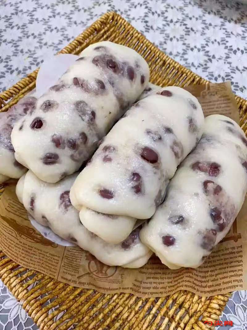 工艺:称取面粉500克,加入泡多源A型20克,佳多美Q型0.5克,与面粉干拌均匀,将酵母5克用35度温水化开拌入面粉中,再称取温水275克,加入盐2克,白糖10克溶解均匀,倒入混合好的面粉,揉成光滑面团,放入醒发箱醒发30分钟,醒发箱湿度75度,室温38度,将醒发好的面团揉匀排气,搓成长条,分成约60克左右的小面团,擀成面皮,包入适量蜜豆,将收口封严,收口朝下轻轻按扁擀开,擀成牛舌状,从一头慢慢卷起来,全部做好后再次放入醒发箱醒发20分钟,将醒发好的蜜豆卷摆放蒸笼,温水入锅,水开大火蒸制15分钟即可出锅。