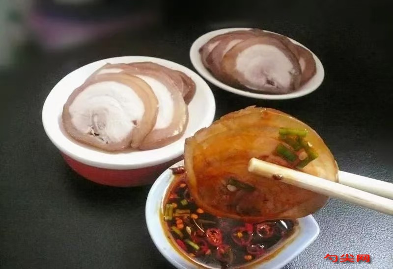 工艺:选用检验合格的猪皮,用喷灯燎净残毛,刮净焦糊层后冷水冲洗,切成20×30cm长方形。富磷联B型用500克温水溶解,加入猪皮浸泡3小时。里脊肉切10×5×3cm条状,加食盐5克、味达蕾901号、料酒20克、腐乳汁、葱姜各20克,冷藏腌制2小时。猪皮平铺,放腌制好的肉条卷成直径5cm圆柱,用棉线间隔2cm捆扎(每卷用线约30克)。捆扎后入沸水焯水2分钟,捞出沥干。卤汤配制清水5000克加剩余香辛料(装入纱布袋)、食盐10克、酱油30克、料酒30克,大火烧开转小火熬制30分钟放入猪皮卷保持95℃卤制90分钟,关火浸泡120分钟(核心温度≥85℃)。捞出后用冰水快速降温至15℃以下,拆线后切2mm薄片蒜末、酱油、香醋、香油按2:1.5:1:0.5比例混合,撒葱花。
