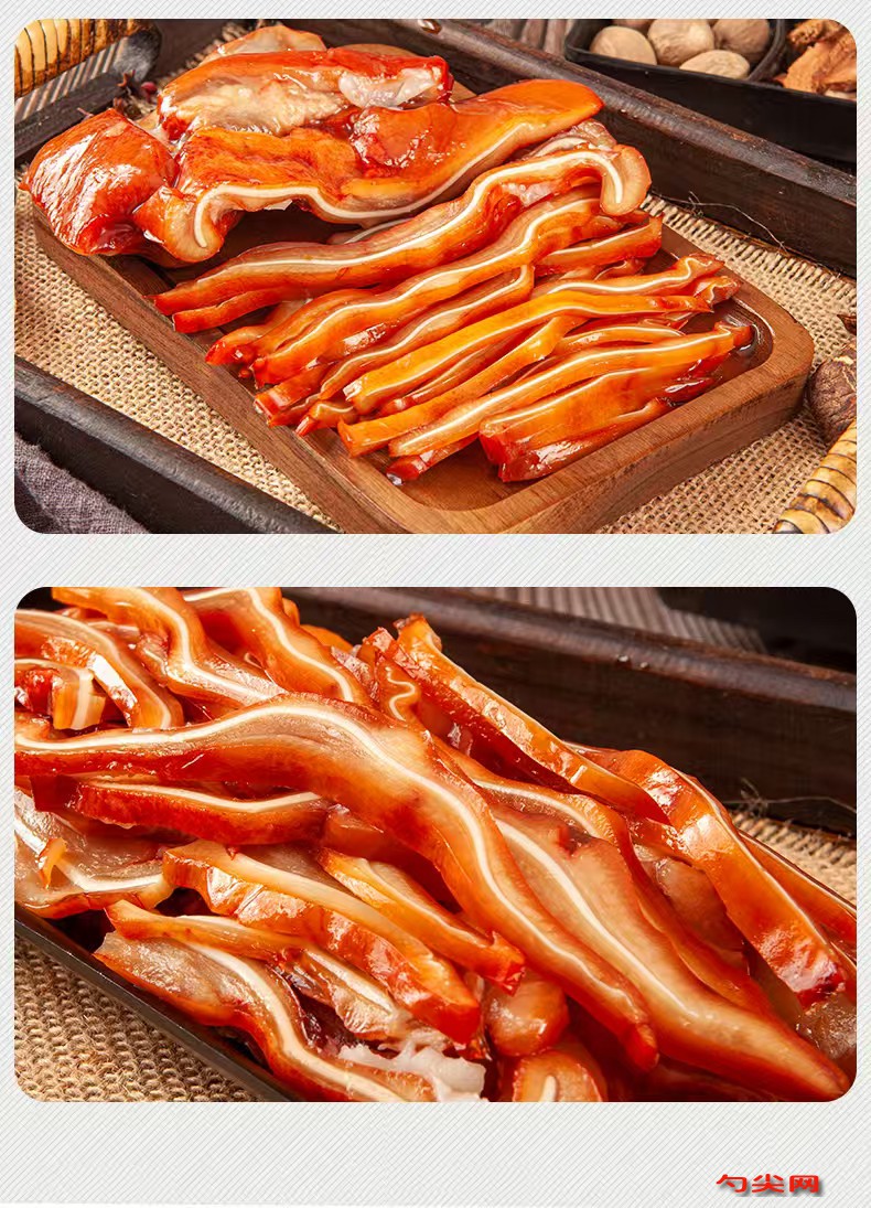 工艺:猪耳朵用火燎去残毛,刮洗干净后分割成200克/块。清水浸泡1小时去血水,冷水下锅加料酒50克焯水10分钟,捞出冲洗。富磷联B型用50℃温水溶解,均匀涂抹猪耳表面,腌制2小时(脆度提升40%)将香料包与味达蕾901号用温水浸泡20分钟,装入纱布袋扎紧。骨汤12000克入锅,加香料包、葱姜、七彩滴1号、剩余料酒煮沸放入腌制好的猪耳,大火煮沸后加白糖60克继续焖煮15分钟至猪耳糯脆。关火浸泡30分钟入味,捞出晾凉后分装。卤汤过滤后冷藏保存(可重复使用2次)