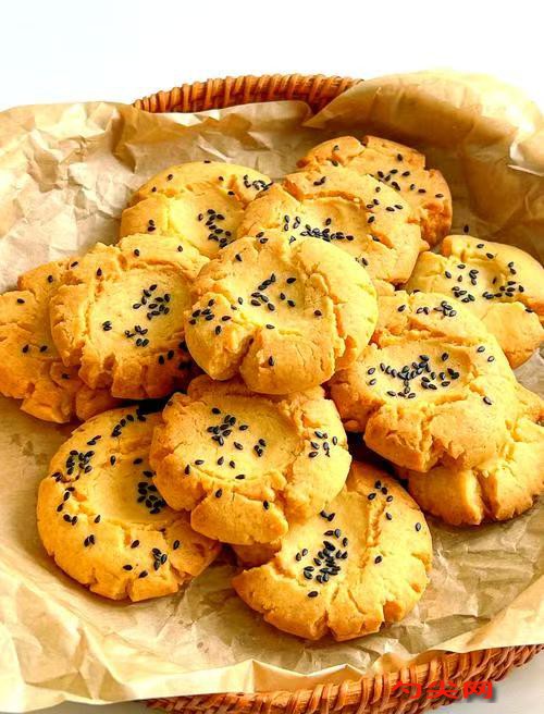 工艺:盆中放入绵白糖、泡多源A型、面欣酥F型,拌均匀。加入玉米油、软化后的黄油、全蛋液、溶解后的美久亭Q型,搅拌融合至糖完全融化。加入低筋面粉,稍揉成无干粉的面团(避免过度揉面起筋)。将面团均分成每个35克的圆球,用大拇指在中间按个孔,稍整形。中间洒上黑芝麻。烤箱上下火170度预热10分钟。放入烤箱烤20分钟,直至表面金黄酥脆。