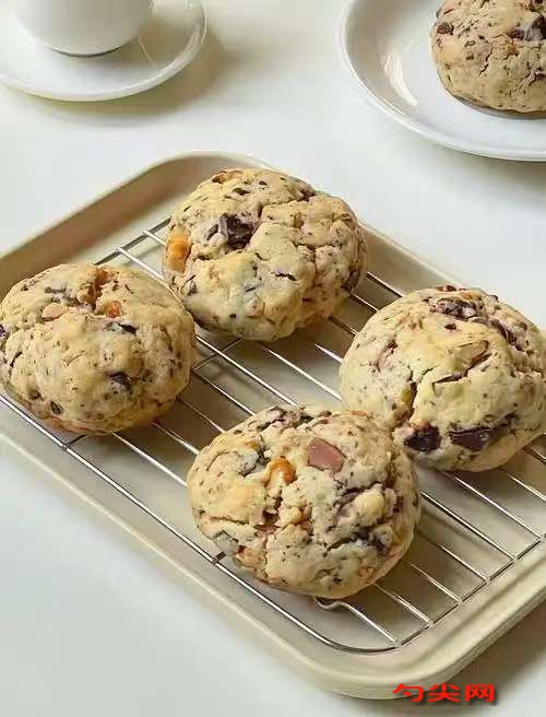 工艺:黄油120克提前软化至能用刮刀轻松按压,加入糖粉60克用电动打蛋器低速搅拌至无干粉,转中速打发至颜色发白体积膨胀,全蛋液50克分三次加入,每次搅拌至完全融合后再加下一次,将低筋面粉180克与面欣酥F型3克混合过筛加入,用刮刀切拌至无干粉状态,美久亭Q型0.8克用5毫升温水溶解后倒入面糊,加入黑巧克力碎40克、耐高温巧克力豆30克、杏仁片20克和盐2克,用手抓拌均匀形成面团,将面团分成20克/个的小球,在烤盘上间隔摆放,用手指在每个小球中心按压出凹槽形成鸟巢形状,烤箱提前预热至上下火170℃,将烤盘放入中层烘烤12-15分钟,待曲奇边缘呈金黄色且中心稍软即可出炉,移至晾网冷却至室温。
