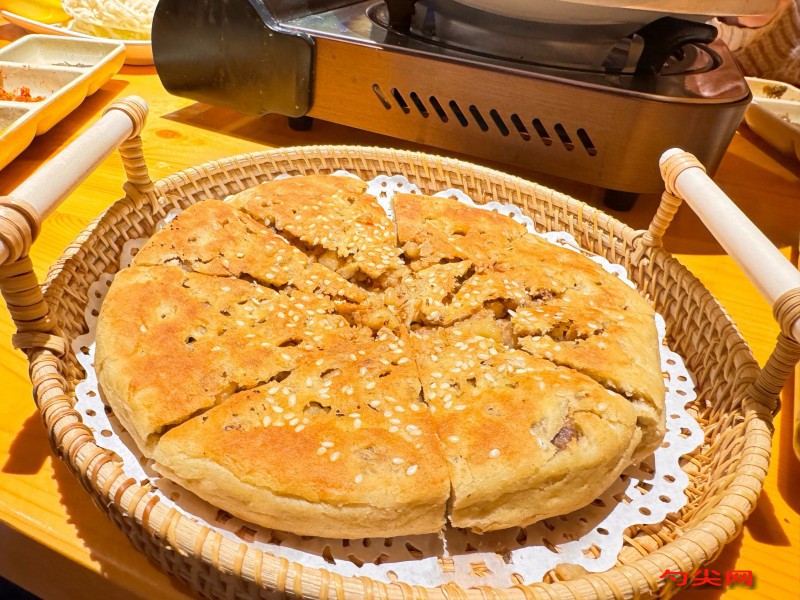工艺:将中筋面粉500克与面欣酥A型5克干拌均匀后倒入大盆,加入酵母粉5克、白糖30克、盐3克,缓慢倒入250克温水,边倒边搅拌至无干粉状态,揉成光滑面团后加入猪油20克,继续揉至面团能拉出均匀薄膜,覆盖保鲜膜放入发酵箱,温度35℃、湿度75%条件下醒发至原体积2倍大,取出面团轻压排气后分割成50克/个的面剂,团圆后覆盖保鲜膜松弛15分钟,将松弛好的面剂擀成圆形面片,中间放入15克烤熟切碎的核桃仁和适量熟白芝麻,收口捏紧后按扁,用擀面杖轻轻擀成圆饼,表面刷蜂蜜水后沾满白芝麻,摆入烤盘放入发酵箱进行最后醒发,温度38℃、湿度80%条件下醒发至1.5倍大,烤箱预热至180℃,将醒发好的饼坯放入中层,上下火180℃烤制12分钟,观察表面金黄后取出震盘自然冷却至35℃以下。