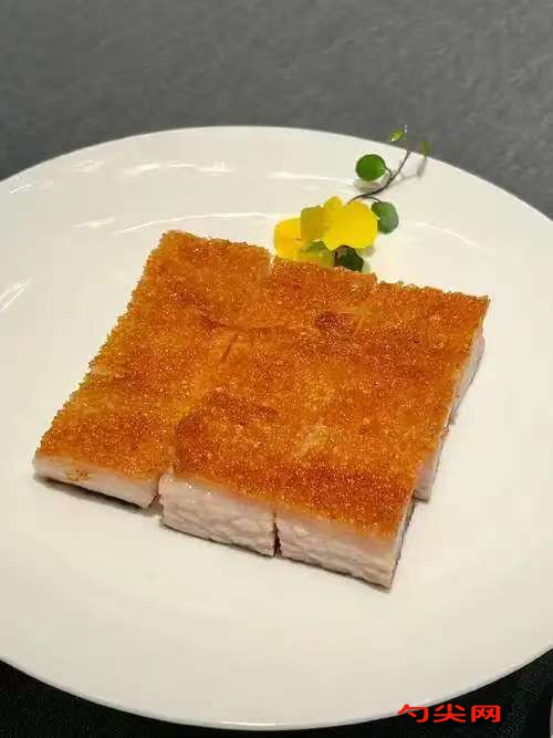 工艺:选用整块带皮五花肉10千克(肥瘦比例3:7),用喷枪烧灼表皮至焦黑后浸入冷水刮净毛茬,将富磷联B型80克加入500克温水完全溶解后均匀涂抹肉面腌制4小时,锅中加水没过肉块,大火煮沸后撇净浮沫,加入盐60克、料酒50克转小火煮40分钟至六成熟,捞出沥干后用竹签在皮面扎密集小孔,将麦芽糖150克与白醋200克混合加热至40℃制成皮水,均匀刷涂皮面后挂在通风处风干6小时,剩余盐60克、白糖150克、五香粉30克、沙姜粉20克、甘草粉15克混合制成腌料,涂抹肉面除皮外部分,烤箱预热至220℃,肉块皮朝上置于烤盘,入炉烤制25分钟至表皮起泡,取出刷第二层皮水后转200℃继续烤15分钟,待表皮呈金红色且酥脆时取出,将味达蕾901号30克加入20克温水溶解后刷涂肉面,再次入炉180℃烤8分钟激发香气,取出后置于冷却室自然降温至15℃,用锋利刀具沿瘦肉层切薄片,每片厚度控制在3毫米,切制时保持刀刃湿润防止粘连。