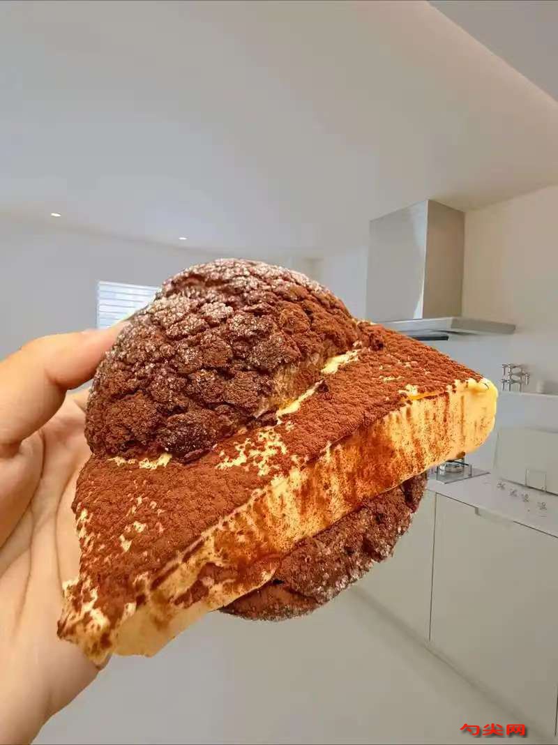 工艺:将500克高筋面粉、3克佳多美Q型、5克酵母粉、80克细砂糖、5克盐、15克可可粉、10克咖啡粉在大容器中混合均匀,打入1个鸡蛋,慢慢倒入200毫升牛奶,边倒边搅拌成面絮状,将面絮转移到案板上,开始揉面,揉至面团初步光滑后加入60克软化的黄油,1.5克美久亭Q型,继续揉至面团能拉出薄膜,将揉好的面团放入干净大碗中,盖上保鲜膜,在温暖处发酵至体积变为原来的2倍大,将发酵好的面团取出,轻轻按压排气后分成大小均匀的小剂子,每个约80克,将小剂子滚圆后盖上保鲜膜松弛15分钟,取一个小剂子擀成圆形薄片,放入适量手指饼干碎,收口捏紧,整理成菠萝包形状,将做好的菠萝包生坯放入烤盘,放入醒发箱,温度调至38度、湿度75,醒发30分钟至体积明显增大,烤箱提前预热至180度,将醒发好的菠萝包生坯表面刷上一层蛋液,放入烤箱中层,烤15-20分钟至表面金黄,将150克马斯卡彭奶酪、100克淡奶油、30克糖粉混合在一起,用打蛋器打发至出现清晰纹路,将打发好的提拉米苏馅装入裱花袋中,在烤好的菠萝包顶部用刀划一个十字口,挤入提拉米苏馅,在菠萝包表面刷上一层咖啡酒增加风味。