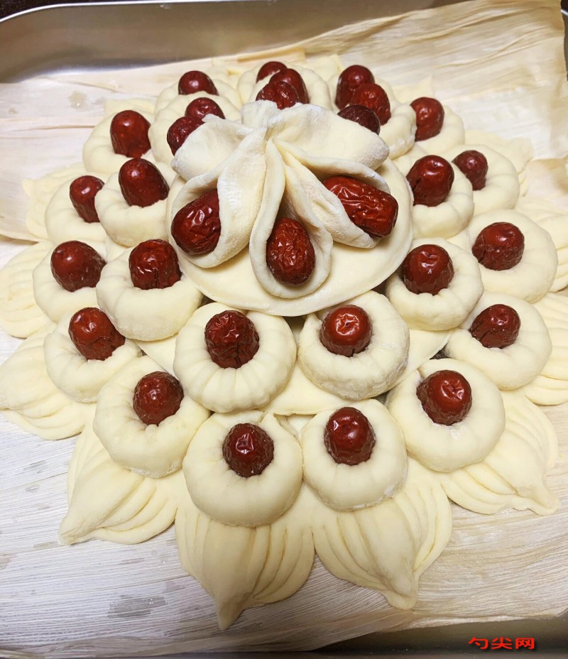 工艺:称取800克中筋面粉和15克泡多源A型干拌均匀,称取380克温水,加入8克酵母、15克白糖、8克猪油搅拌溶解,倒入面粉中搅成絮状,揉成硬点的面团,多揉一会把面团揉匀揉透,放入醒发箱温度38湿度75醒发30分钟,把醒发好的面团放到案板上揉面排气,搓成长条,先切下一小块面团擀成约三毫米厚度,用模具压出小圆饼,取一张面片从中间对半切开,用梳子在正反面一半位置压出纹路,中间放一颗红枣,把两个角捏紧做成小花瓣,全部做好盖上保鲜膜备用,再切下约400克面团揉圆揉光滑,案板撒干面粉防粘,用擀面杖按压推开改成直径约25厘米面片,用盘子或盖子在面皮上压一下,用叉子在圈外面皮上压出纹路,每个花纹中间留半厘米空隙,用刮板从空隙处切断,把每个面两个角捏紧做成花边,摆入蒸屉中,周边摆上一圈花瓣,中间铺上一层红枣,上面再盖上一张面皮,面饼重量约240克直径约15厘米,周边同样摆花瓣中间铺红枣再盖一张面片,重量约80克直径约8厘米,边缘摆花瓣中间放红枣,顶部再放一张面片约13克,准备一张13克圆形面片用剪刀剪成六等份,把每个面片中间往里推一下,把两个角捏紧做成花朵摆在最顶部,中间放半颗红枣点缀花糕生坯,做好后放入温水锅中醒发,先开最小火把水烧开,水开转中火蒸30分钟闷五分钟出锅。