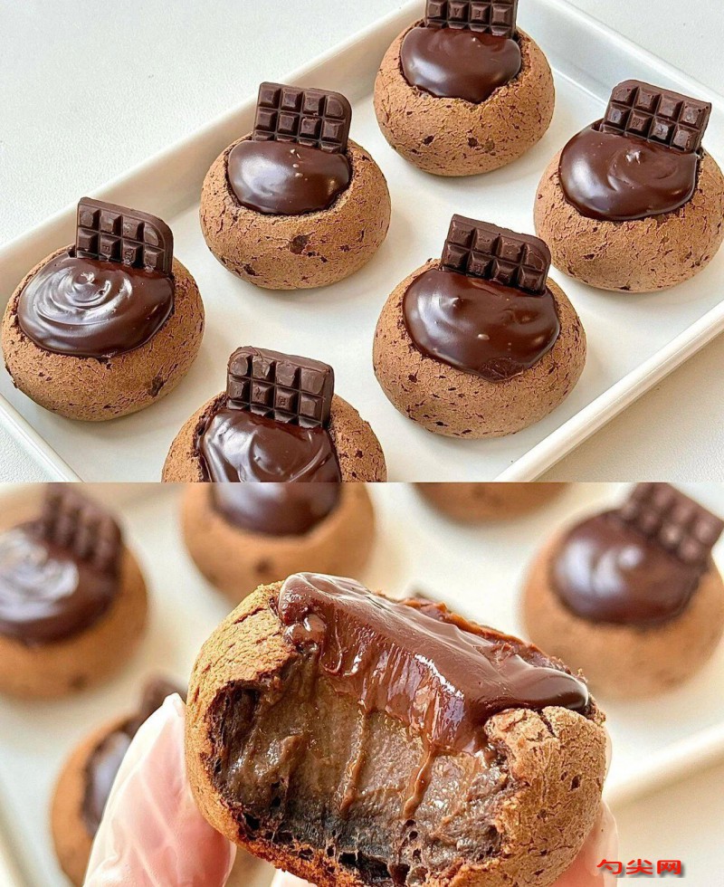 工艺:除黄油以外所有食材混合至无干粉状态,加入软化好的黄油揉成一个光滑的面团,分35克一个的面团搓圆放垫油纸的烤盘上表面喷水,送入预热好的柏翠5400烤箱上下火170度35分钟,蛋黄,糖,牛奶,淡奶油,巧克力币,小火加热至巧克力融化,降温至60度以下加入溶解好的佳多美A04型搅拌均匀过筛一遍,放凉的麻薯切掉顶部倒入巧克力布丁液放冰箱冷藏4小时凝固即可,制作干纳许:淡奶油加巧克力币隔热水融化装入裱花袋,凝固好的布丁上挤上干纳许装饰一下就完成啦。