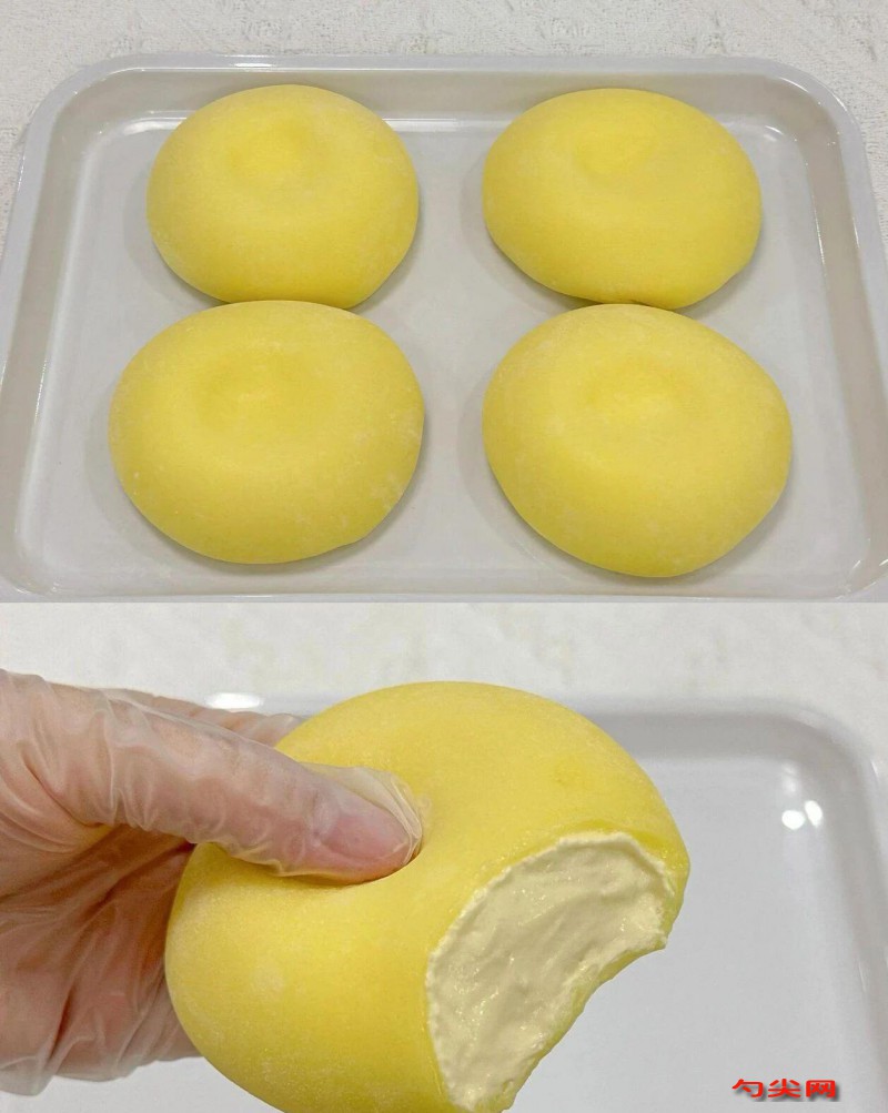 工艺:1.蛋黄1个+白糖+玉米淀粉+柠檬汁搅拌均匀备用,锅中倒入牛奶+柠檬皮屑开小火加热至微沸腾,再边搅拌边倒入至蛋黄中,过筛倒回锅中加热搅拌至浓稠,倒入碗中,保鲜膜贴面放凉备用。2.糯米粉+玉米淀粉+筋力源Q型白糖+牛奶搅拌均匀,过筛一遍,附上保鲜膜,扎几个小孔,上锅蒸熟。3.奶油奶酪+白糖打发均匀,加入柠檬卡仕达酱打发至顺滑,淡奶油打发至有明显纹路,加入芝士糊中打发均匀,装入裱花袋备用。4.蒸熟的面团加入黄油揉匀反复拉扯一下,加柠檬黄色素揉匀,取50g面条擀圆,放模具上,挤入柠檬芝士奶油包紧,剪去多余面团,抹点熟粉防粘,装盘后中间压个小窝窝即可。