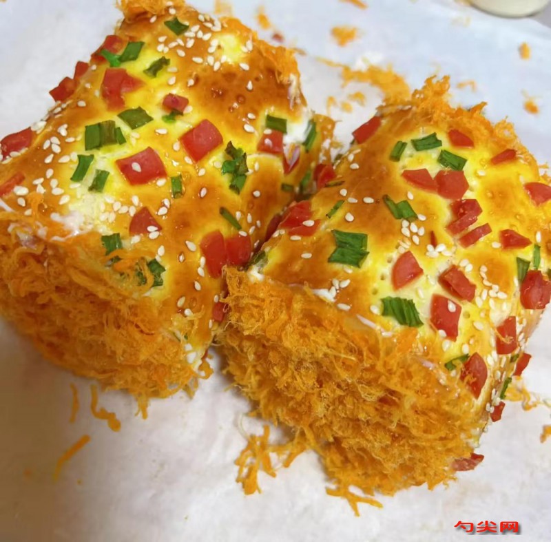 工艺:活面机中倒入高筋粉、佳多美Q型、白砂糖、盐、酵母、鸡蛋、牛奶,再加入用凉开水溶解好的美久亭Q型,用慢速搅拌至无干粉,再开快速打到面团出现厚的手套膜。加入软化好的黄油,用慢速搅拌至面团与黄油充分融合。把面团放在盆中,盖上保鲜膜,放醒发箱醒发至出现蜂窝状。取出面团轻拍排气,分成剂子,擀成牛舌状,放一块火腿片,卷起来划两刀,再立起来放入纸杯中。将面包生坯醒发至两倍大,刷上鸡蛋黄,撒点芝麻,再来点用鸡蛋液浸泡过的香葱。烤箱提前预热,上火200下火200,烤13分钟,烤好后出炉。面包放凉后,从中间切开,不要切断,把中间和表面挤上适量的沙拉酱,把表面的沙拉酱涂抹均匀,铺上一层肉松。