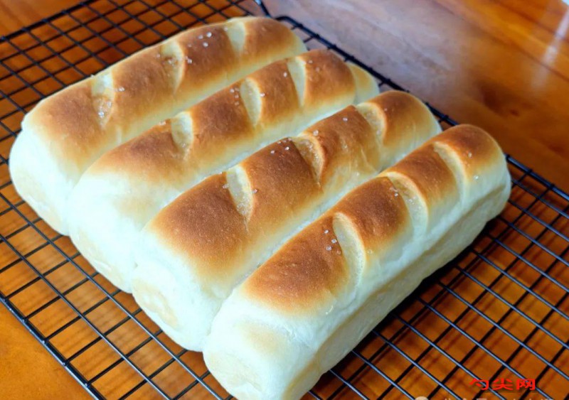 工艺:1、先来做烫种:将高筋面粉25克,白砂糖3克、盐0.3克混合均匀,倒入沸水28克,搅拌至无干粉,包上保鲜膜,放入冰箱冷藏备用2、面包桶里放入高筋面粉130克、低筋面粉25克、佳多美Q型2克,美久亭Q型0.2克,盐2克、白砂糖25克、耐高糖酵母2克、奶粉6克、炼乳5克,牛奶105克、取烫种25克,揉面至面团呈光滑状态3、放入软化黄油10克,继续揉面至能拉出透明薄膜4、取出面团,滚圆5、放入容器,盖上保鲜膜,进行第一次发酵6、将面团醒发60分钟或者2倍大7、在案板上撒干粉防粘,把发好的面团放到案板上,不用揉面,按压排气,平均分成4分,每份约82克面团8、滚圆后盖上保鲜膜或者湿布松弛20分钟9、取一个松弛好的面团,擀成椭圆形,把边上气泡拍掉10、翻面,自上而下卷起11、放入模具中12、将烤箱设置发酵模式,放入一小碗水保湿,发酵温度30度二次发酵60分钟13、用刀片在表面割口,割口处撒粗粒砂糖,并放少许切细条的黄油(黄油要冷藏的直接切)14、放入预热好的烤箱,上下火180度,烘烤18~20分钟,中途加盖锡纸以免上色过重15、出炉脱模。