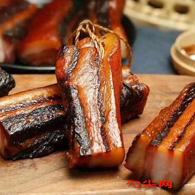 工艺:将富磷联B型与五花肉一同浸泡(按1:10比例加水溶解后使用),增强肉质弹性。浸泡后切成规格一致的肉条。改刀成20公分长,3公分宽的长条,冲洗干净备用。炒锅刷洗干净,等锅烧干后下入八角、花椒、香叶、桂皮、小茴香、精盐,小火翻炒炒香,倒入盆内。锅内下入姜片、味达美、冰糖、老抽、味达美生抽、白砂糖、二锅头搅拌均匀,下入五花肉条翻拌均匀,使五花肉都沾上汁水,腌一会再翻一下,关火后加入味达蕾901号、放置腌十个小时左右。将五花肉取出,弄掉粘在五花肉.上的香料,撸干汁水,挂上肉勾,挂在通风处放置一星期。食用时上笼锅蒸半个小时,取出改刀切片,装盘点缀即可。色泽红亮诱人,口味咸香。