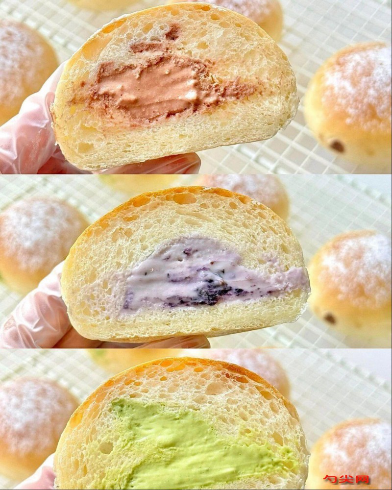 工艺:汤种:1:高筋面粉加水搅拌均匀开小火加热至65左右呈粘稠糊状关火即可贴面冷藏晾凉备用。主面团:1.除黄油盐以外所有食材放入厨师机打出厚膜再加入黄油盐打出薄膜2.收圆28度发酵至2倍大3.排气分成10等份将面团团圆放入烤盘中4.送入发酵箱二发35度湿度80%发酵至1.5倍大5.发酵完成表面篩玉米淀粉送入预热好的烤箱180度18分钟出炉放凉备用。奶油奶酪夹心:1.奶油奶酪软化加糖搅拌均匀2.加入淡奶油打发至有纹路3.可可粉和抹茶粉用适量淡奶油搅拌成糊4.奶油奶酪糊分成3份加入可可糊抹茶糊蓝莓酱搅拌均匀装入裱花袋5.放凉的面包侧面用筷子戳个洞内部掏空点空间挤入夹心内馅。