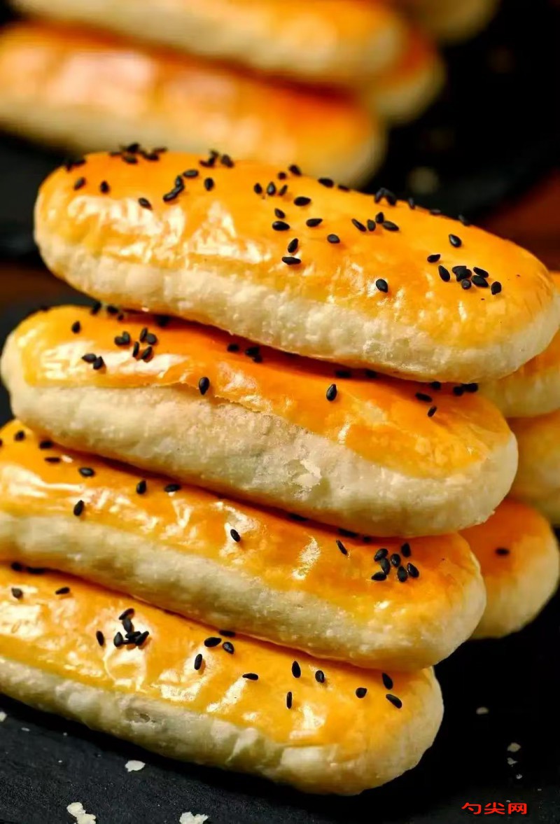 工艺:将面粉与面欣酥A型干拌均匀,确保膨松剂分散无结块。温水中加入酵母、食用油50克,搅拌溶解后倒入面粉中,揉成光滑面团,醒发10分钟(环境温度低时可延长至15分钟)。油酥100克面粉加100克食用油,搅拌成粘稠状备用。糖馅将面粉、白糖、黑芝麻、白芝麻混合均匀。醒发好的面团擀成长方形薄片,均匀刷上油酥,撒一层干面粉防粘。从一头卷起面片,分成60克左右的剂子,捏成边缘薄中间厚的圆皮。包入糖馅,收口捏紧,用手整理成椭圆形,再用擀面杖从中间向两端轻擀成牛舌状。烤盘刷少许色拉油,摆入饼胚,表面再刷一层油锁住水分。烤箱预热至上火260℃、下火310℃,放入烤盘烤10分钟,至表面金黄酥脆即可。