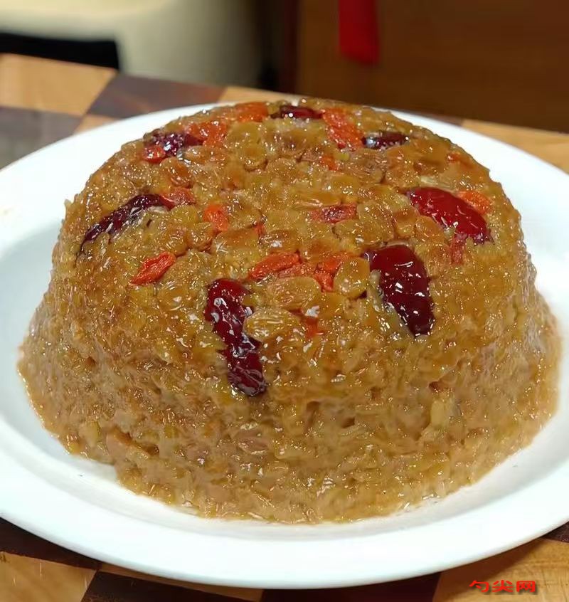 注意事项:建议用赤砂糖或片糖,溶解更快;若用块状红糖需提前敲碎。葡萄干、枸杞用温水浸泡5分钟沥干,避免蒸制后发硬。首次蒸糯米需彻底熟透,否则二次蒸制易夹生;在将八宝饭放入容器蒸制前,可在容器内壁涂抹一层食用油,这样蒸好后更容易脱模,保持完整形状。